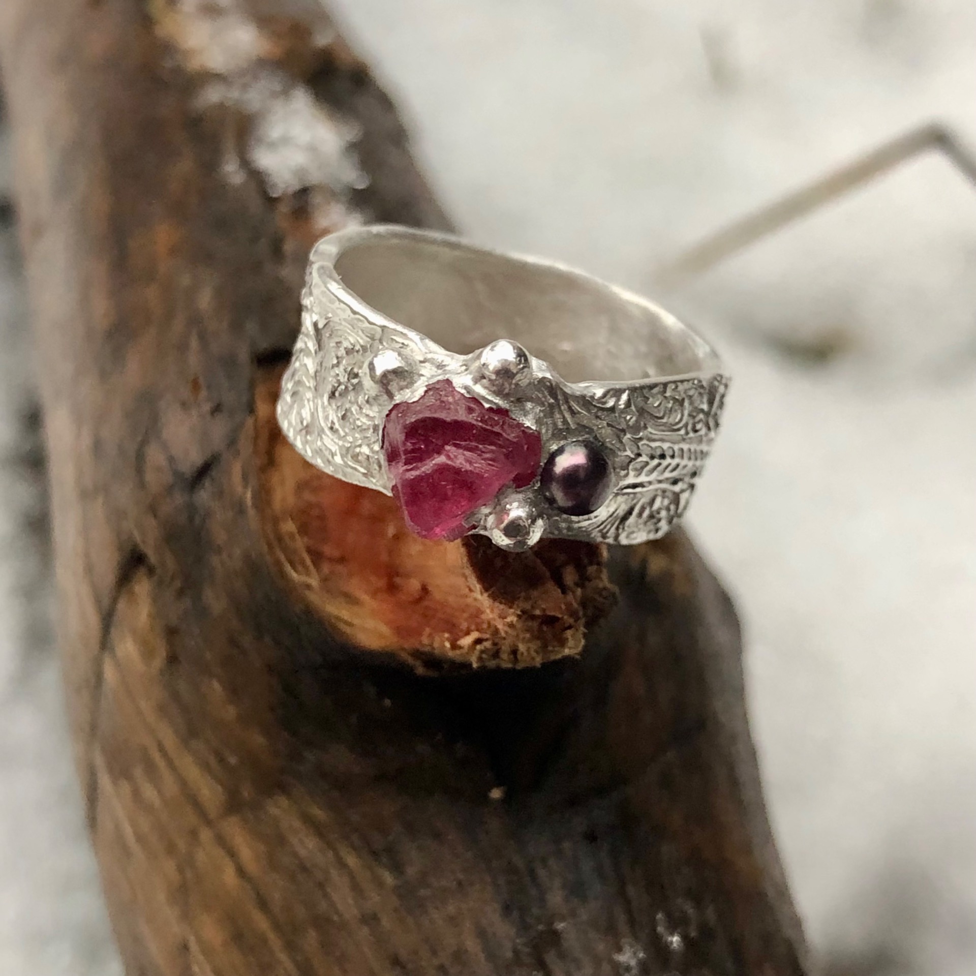 Jedinečný prsten s přírodním neopracovaným a vzácným růžovým spinelem, s malou říční perličkou a třemi stříbrnými kuličkami. Prsten je vyroben ze stříbra o ryzosti 99,9%. Takové stříbro není komerční, říká se mu investiční, protože je naprosto čisté. Tudíž hypoalergenní a s mocí, kterou mu nadělila příroda. Na jeho výrobu jsem použila stříbro ekologické, netěžené, ale recyklované a běžně ho ve zlatnictví nekoupíte. To ani tento prsten, protože je vyrobený ručně a je naprosto originální. Je nepravidelný, nespoutaný, pohodlně se nosí....