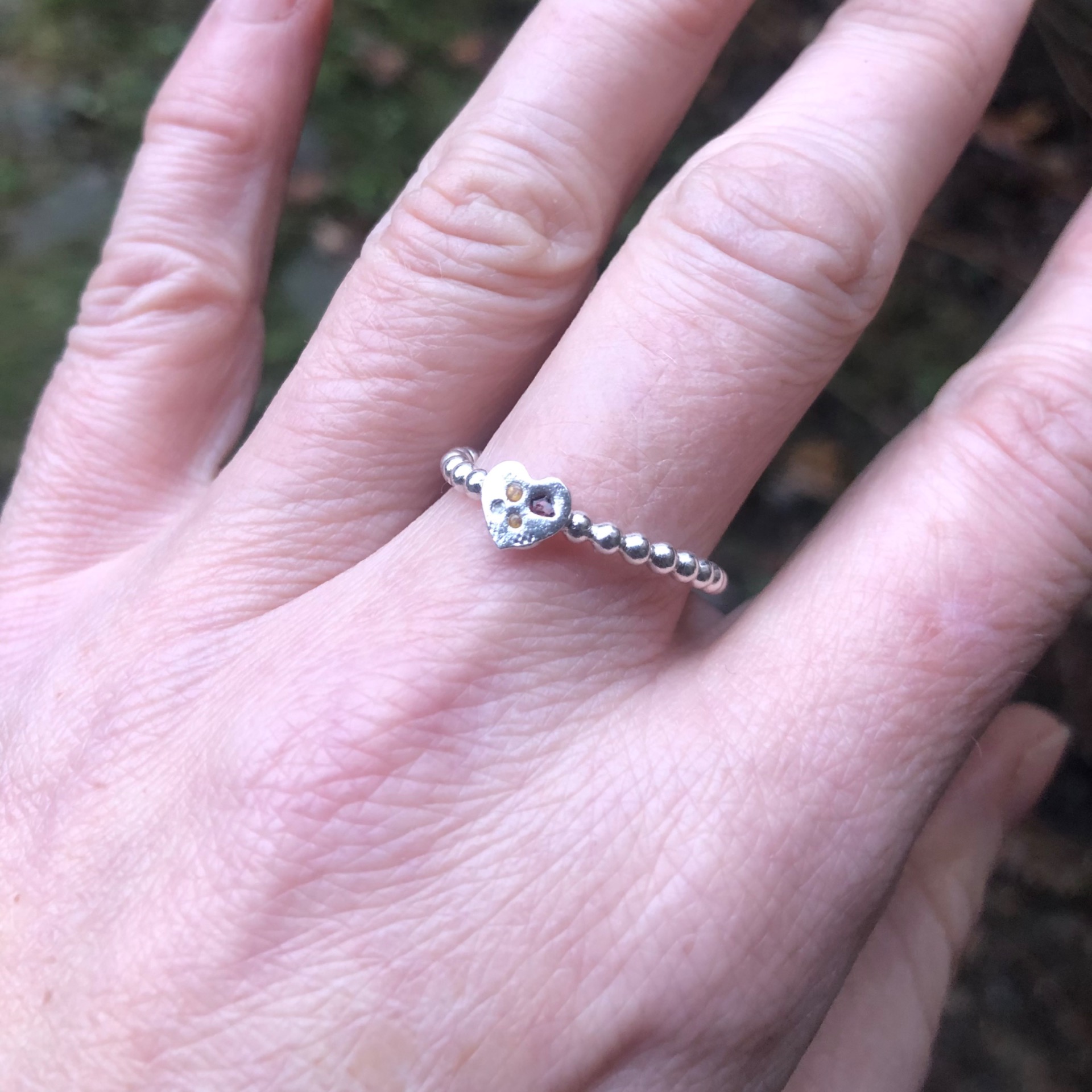 Malé srdíčko s rubínkem a sklíčky na perličkovém kroužku. Srdíčko je ze stříbra 999/1000 a kroužek ze stříbra 925/1000.