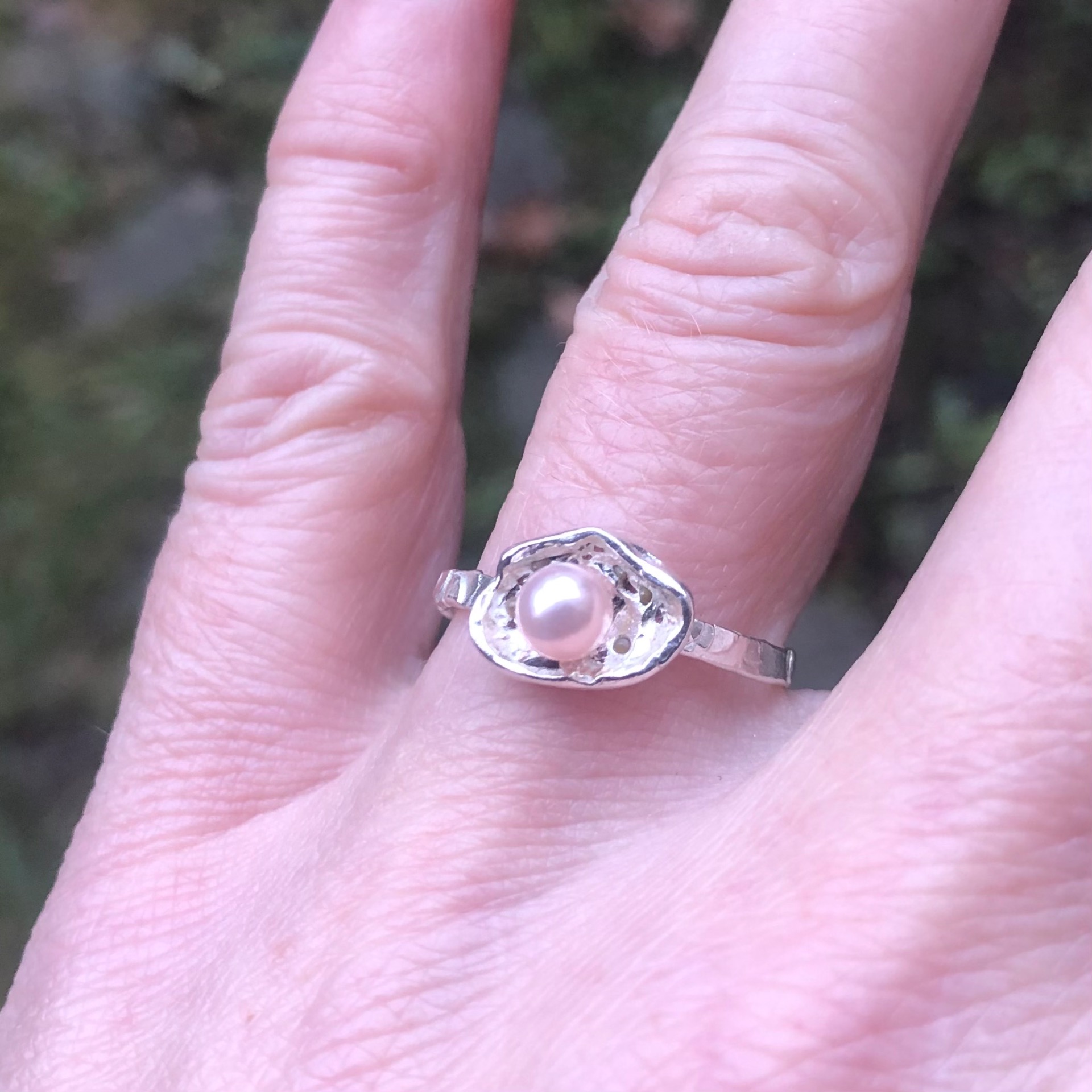 Minimalistický prsten s výraznější růžovou perlou v misce ozdobené rubínky. Miska je ze stříbra o ryzosti 99,9% a tělo prstenu je z běžného stříbra označovaného 925/1000.